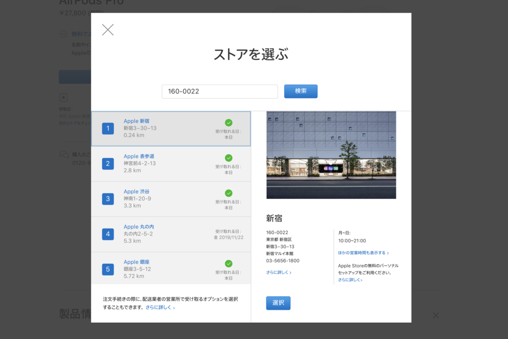 店舗受け取りの場合、ほぼ全てのAppleストアで本日中の受け取りが可能です!